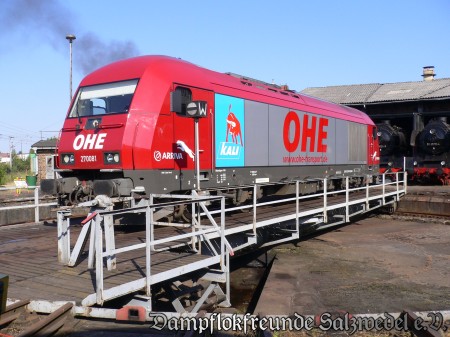 Anlässlich der Hansetage war am 08.06.2008 war die Diesellok OHE 270081 im Lokschuppen zu Gast. Die nachfolgenden Bilder zeigen die Lok auf der Drehscheibe und einige Aufnahmen des Innenlebens.