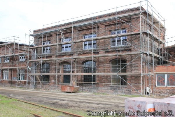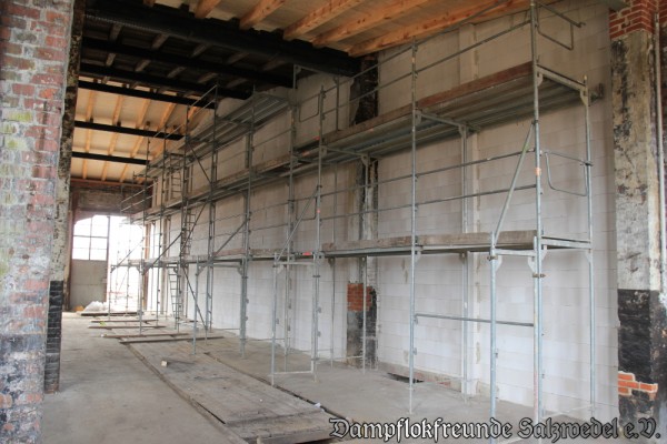 Seit der Winterpause sind auf dem Bau in Wittenberge deutliche Fortschritte zu erkennen. So wurden die fehlenden Teile der Schuppenrückwand wieder aufgemauert und die Dachdeckung fertig gestellt.
