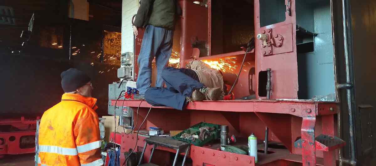 Außerdem wurde wieder am Tender der 50 3570 gebaut. Hier wurden noch einige Bleche an der Stirnseite erneuert, die öfter mal durchrosten. Eine bekannte Schwachstelle bei den Tendern. Wir hoffen, dass die Reparatur des Fahrzeugs nun endlich abgeschlossen werden kann. Während einer die Bleche vorrichtet, schweißen andere sie ein.