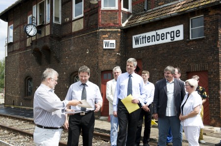 Der entscheidende Augenblick: Der Staatssekretär (l.) übergibt am Stellwerk dem Bürgermeister den Fördermittelbescheid. |